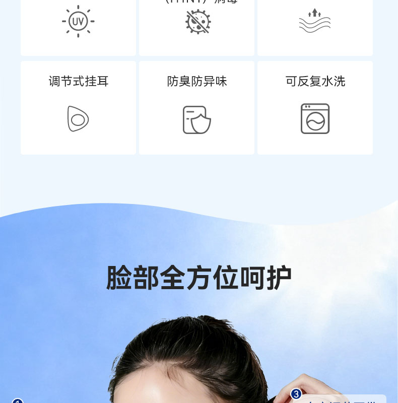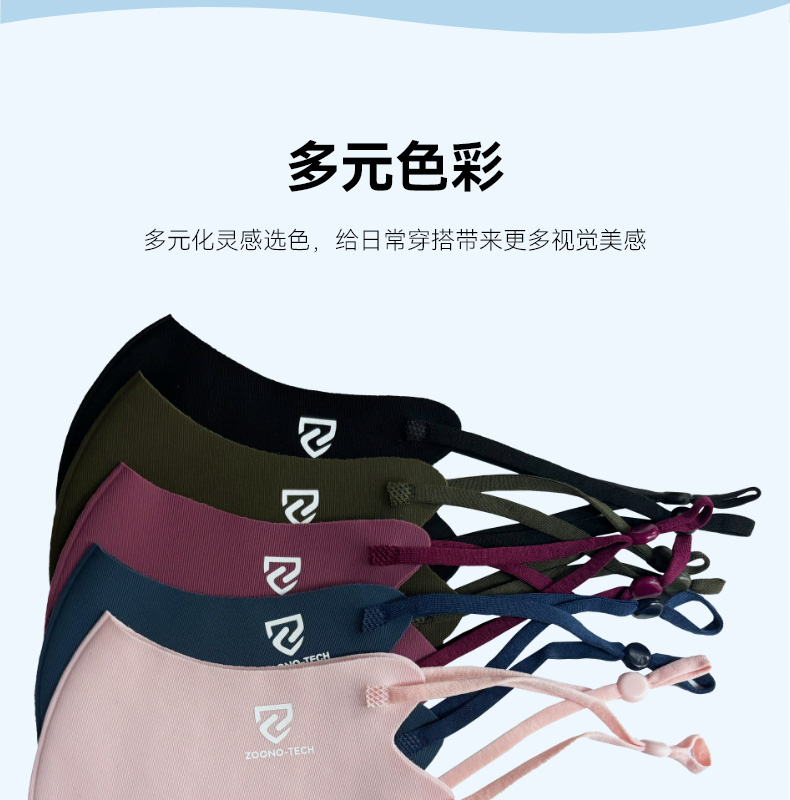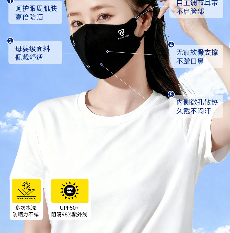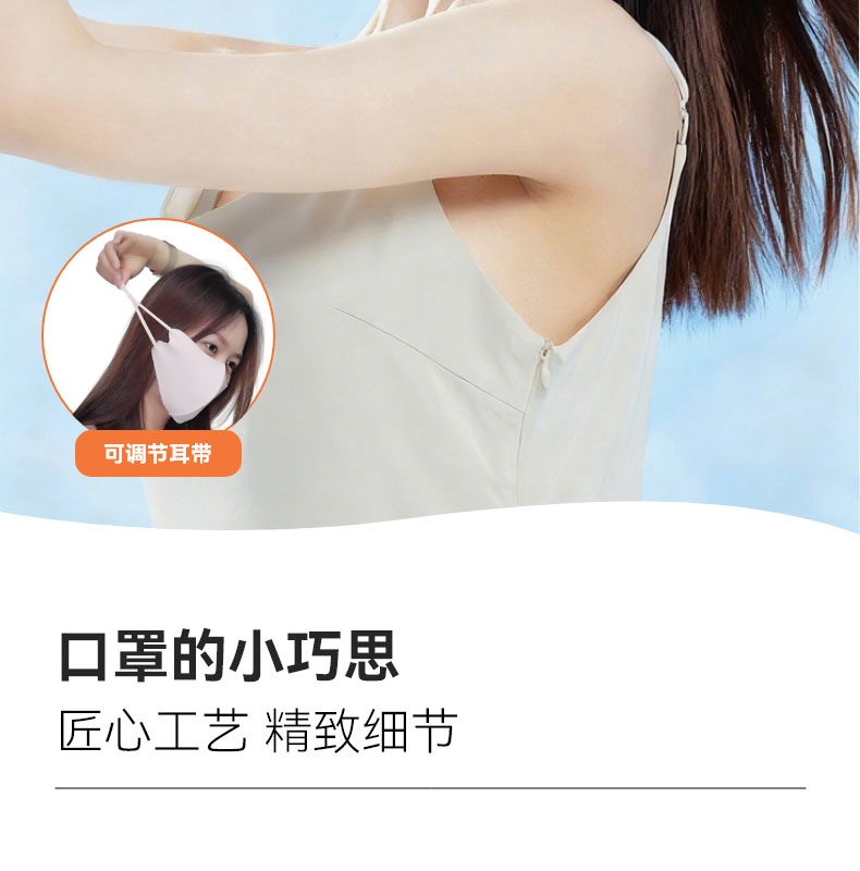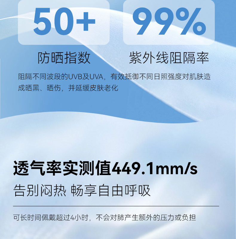 全新升级可调节式挂耳,母婴级面料亲肤贴合,防紫外线UPF50+, 50次水洗抗菌率仍>99.9%,长效守护呼吸健康
