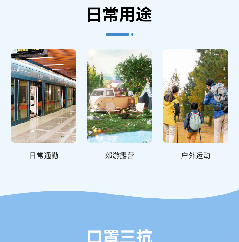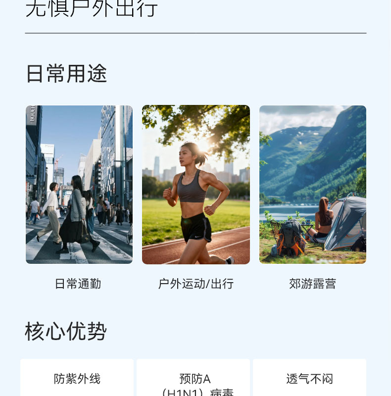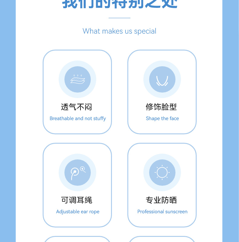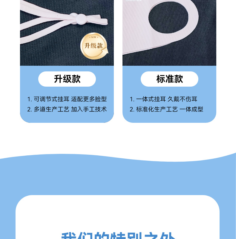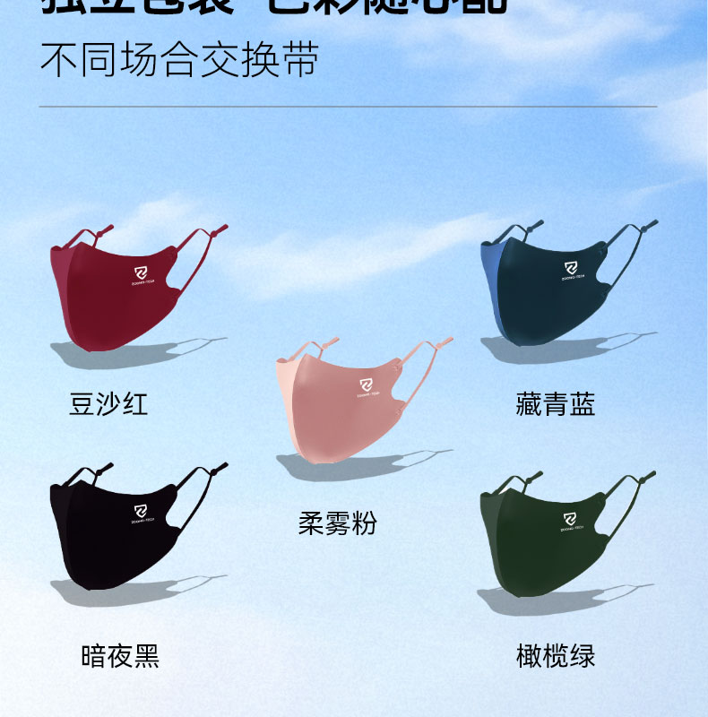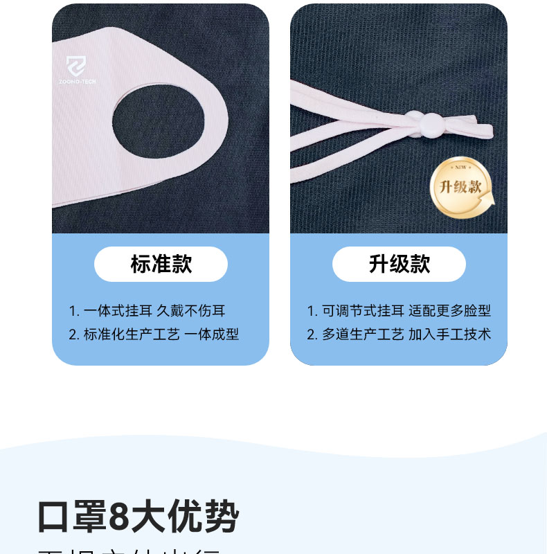 全新升级可调节式挂耳,母婴级面料亲肤贴合,防紫外线UPF50+, 50次水洗抗菌率仍>99.9%,长效守护呼吸健康