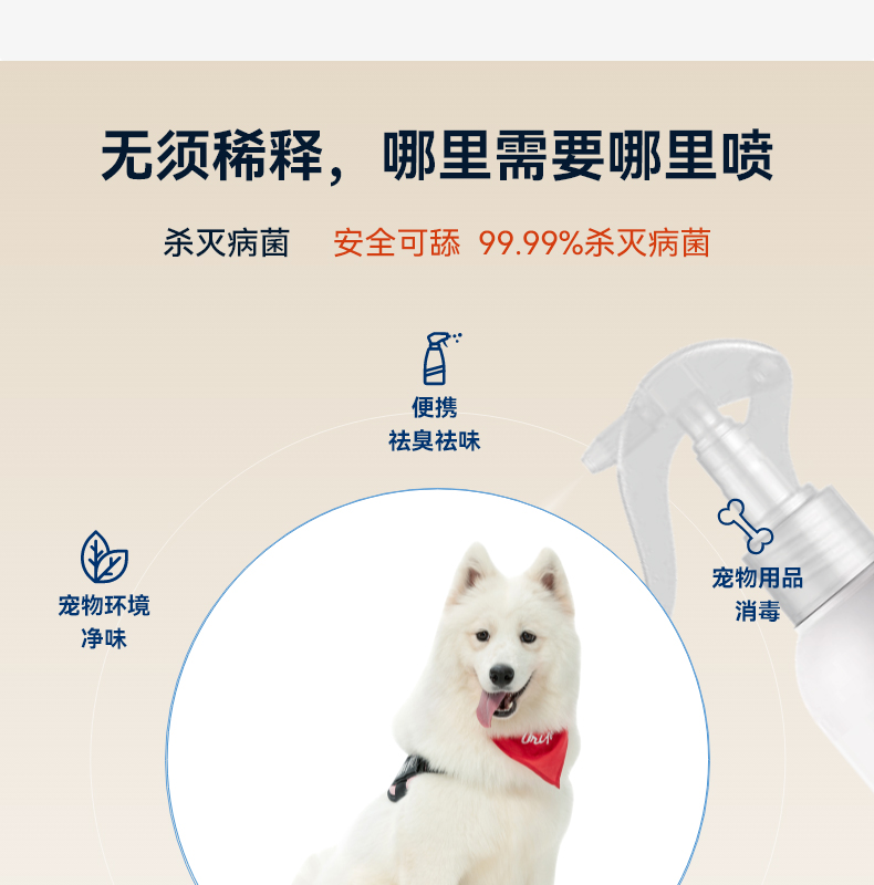 99.99%杀菌抗菌,舔舐无毒,温和无刺激味道,能有效杀灭宠物身上的细菌和病毒,不含刺激性成分,对宠物皮肤和毛发都非常温和,杀灭各种有害细菌,有效预防皮肤感染、皮炎等问题,缓解宠物皮肤瘙痒,持久清爽,易于使用。