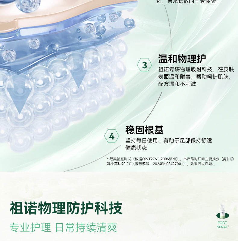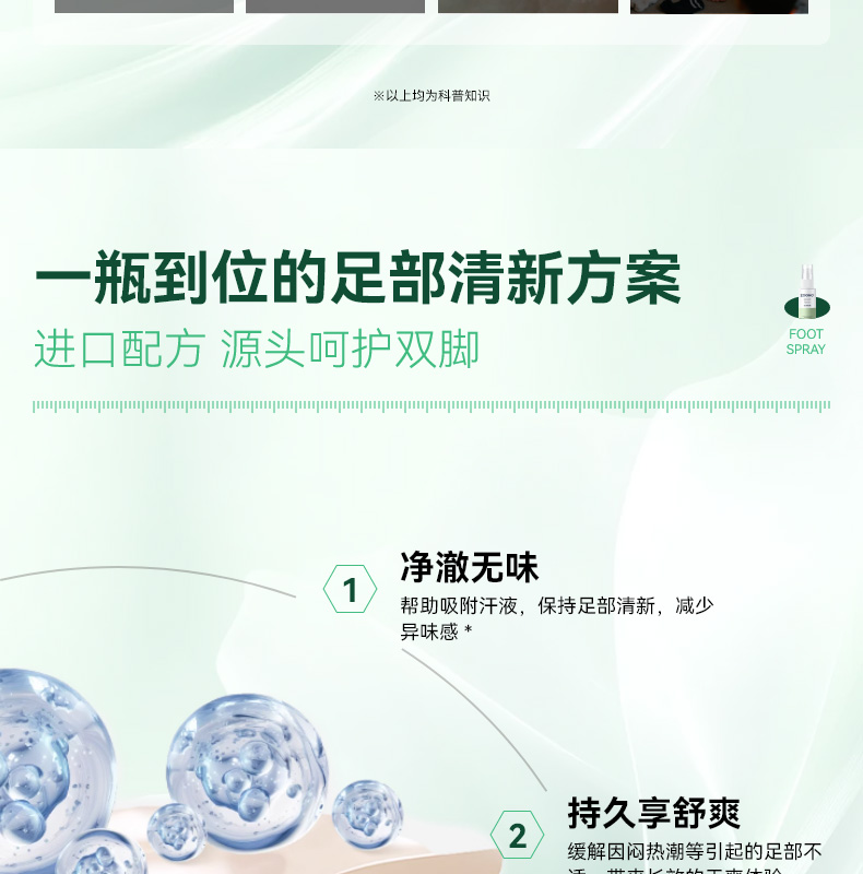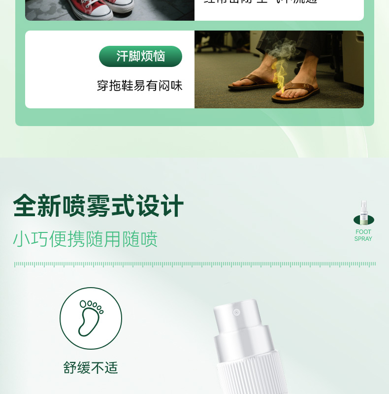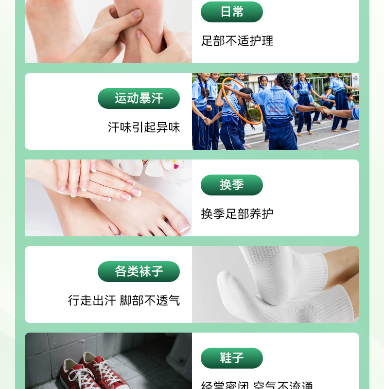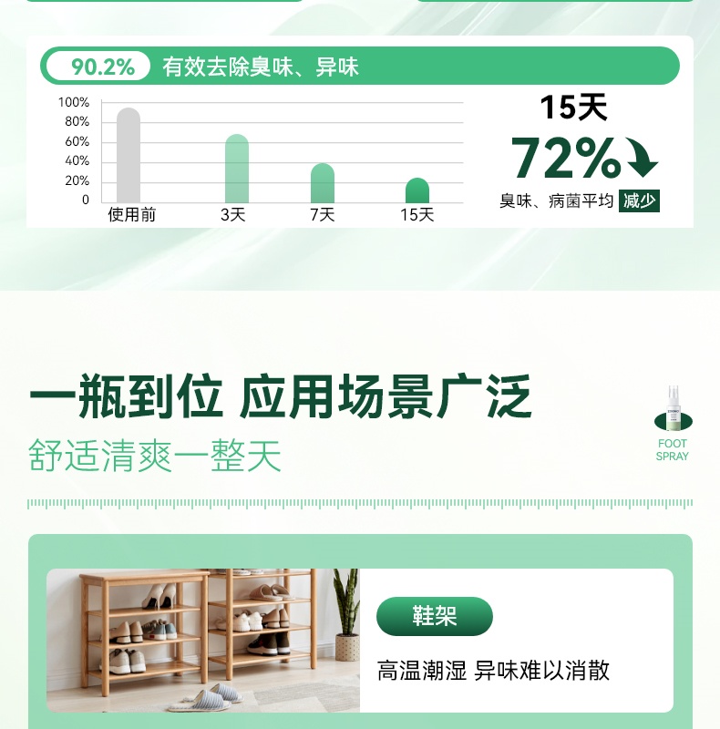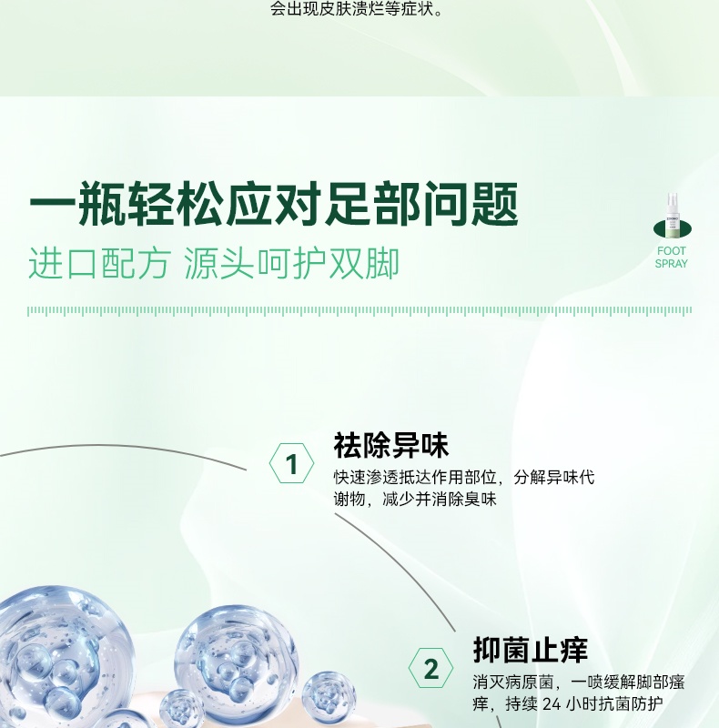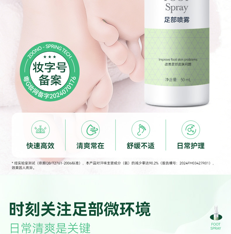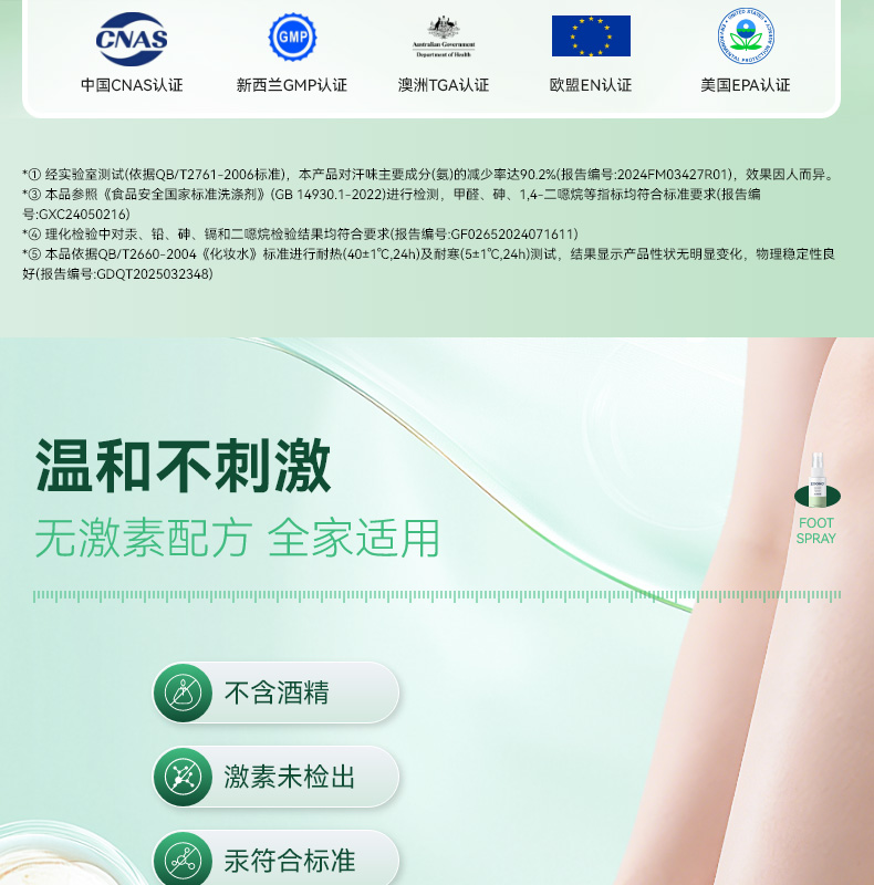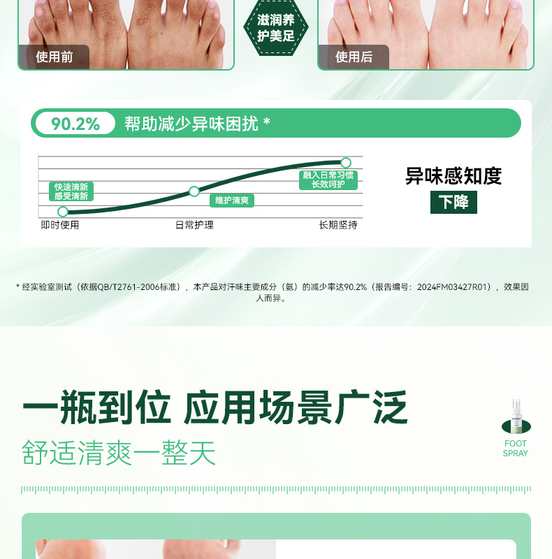 99.99% 高效杀菌去味,0酒精、无重金属等,配方温和不刺激,可有效改善异味,抑制细菌滋生,预防汗臭、脚臭及脚气,防止细菌感染。同时具备清洁、持久保湿功效,能消除皮肤干燥,保持持久清新,适用于孕妇、小孩、老人等各类人群。
