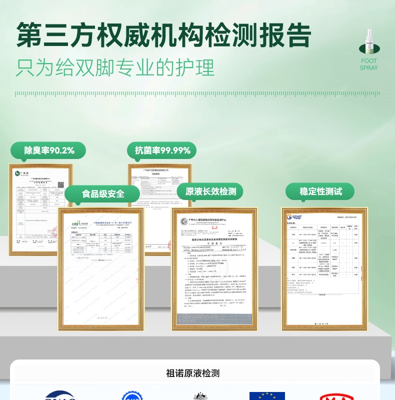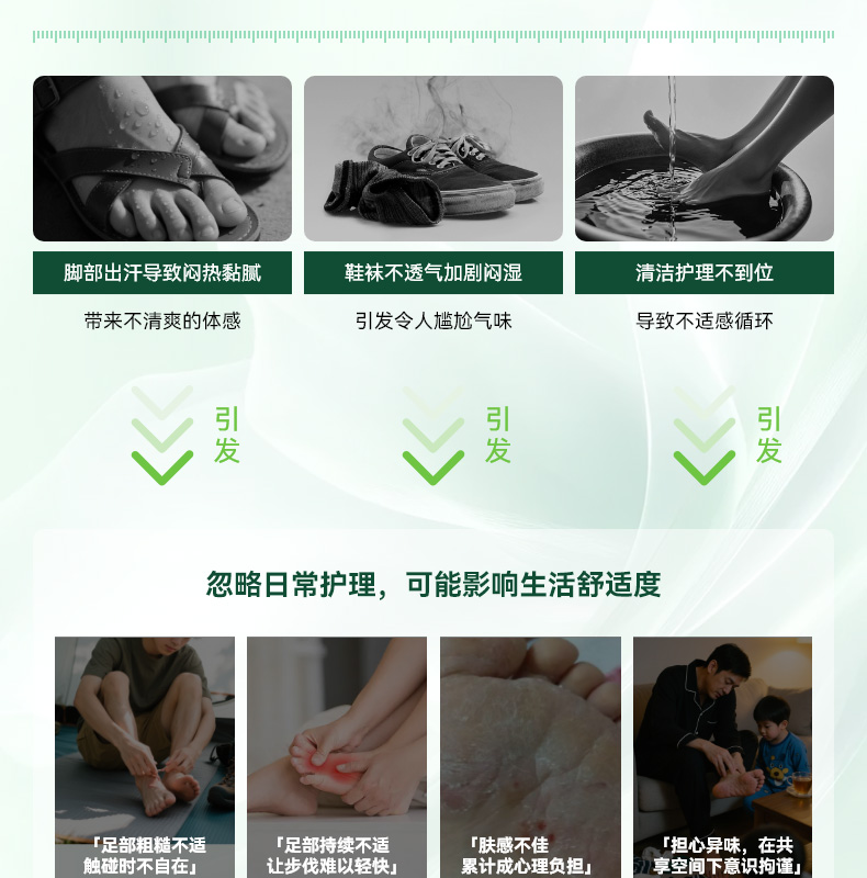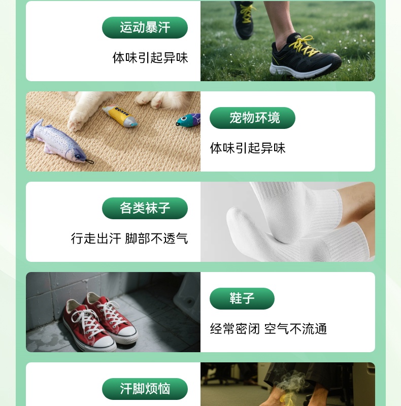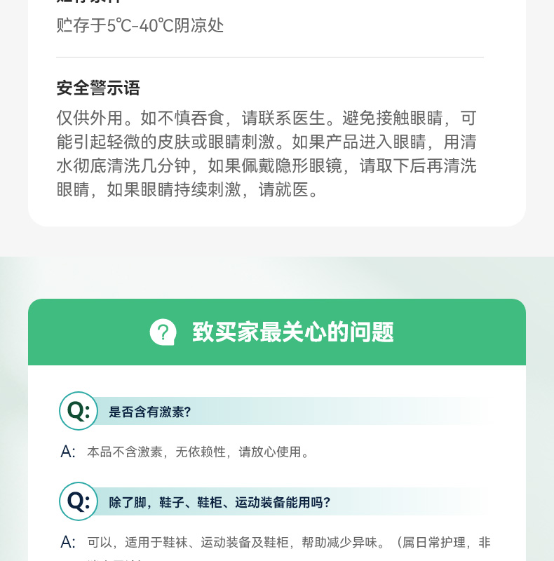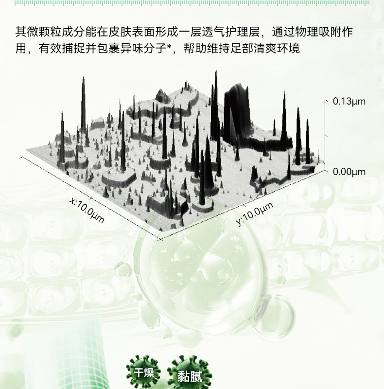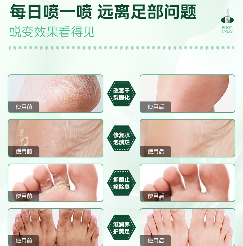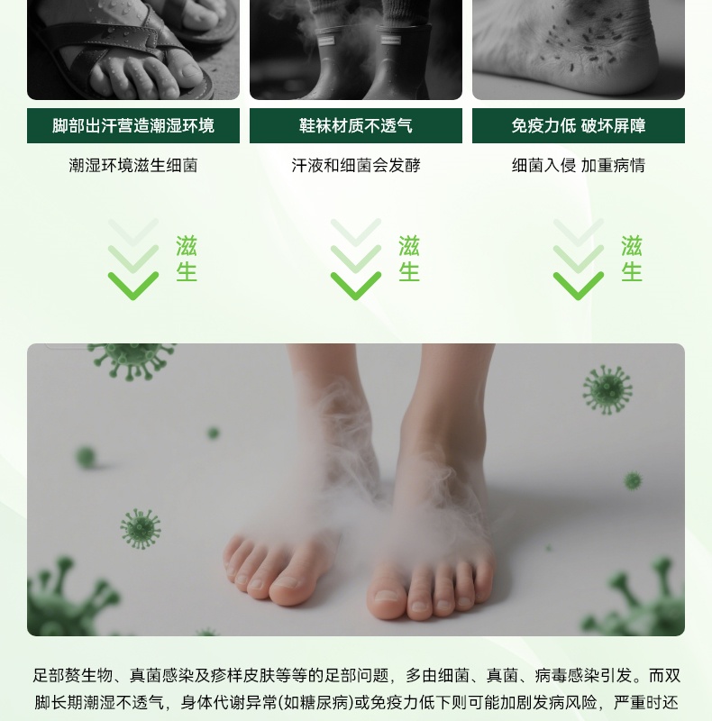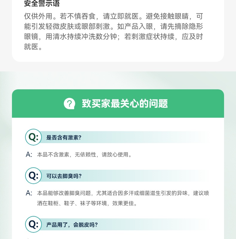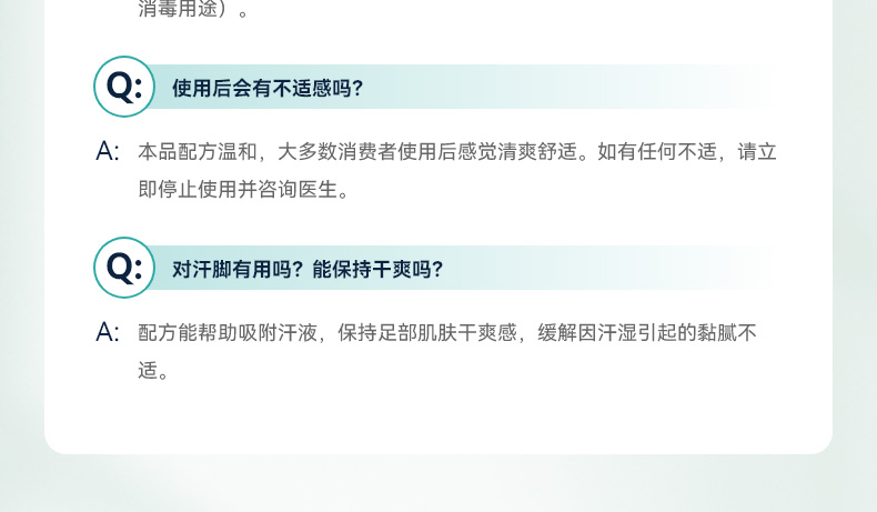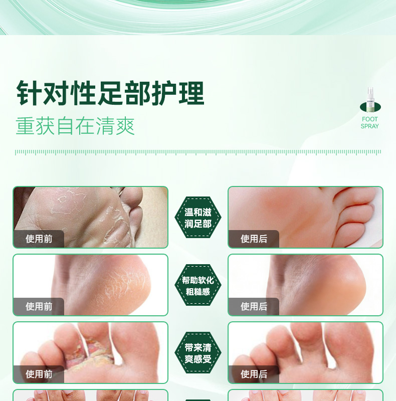 99.99% 高效杀菌去味,0酒精、无重金属等,配方温和不刺激,可有效改善异味,抑制细菌滋生,预防汗臭、脚臭及脚气,防止细菌感染。同时具备清洁、持久保湿功效,能消除皮肤干燥,保持持久清新,适用于孕妇、小孩、老人等各类人群。