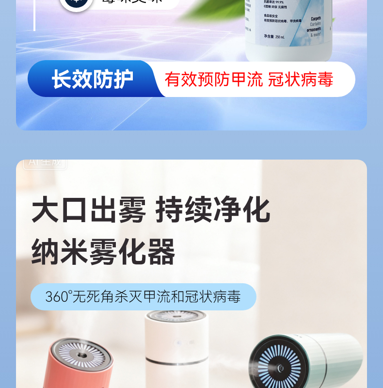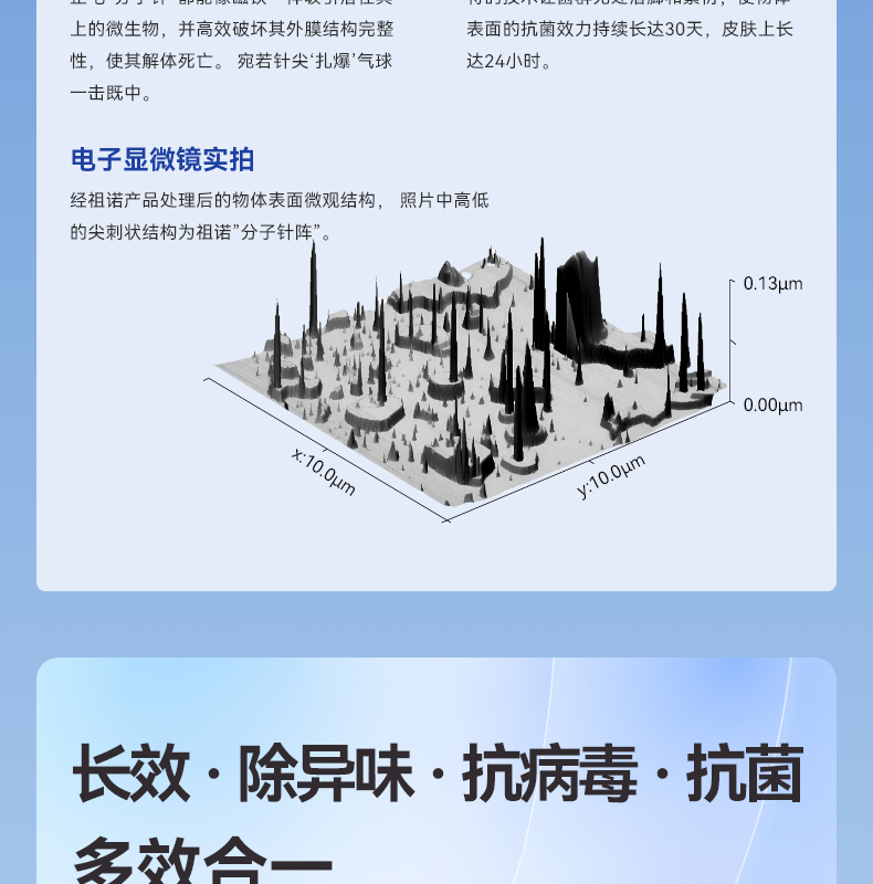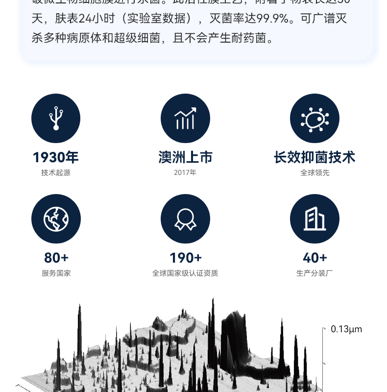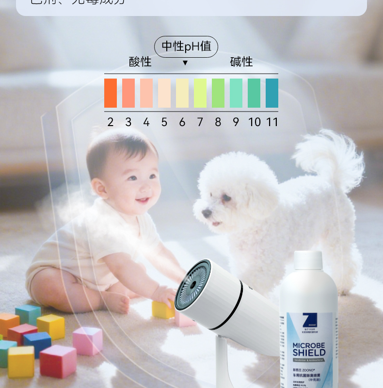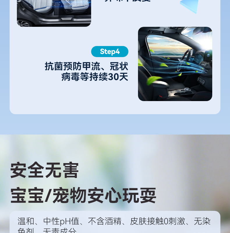 无刺激性,温和,不含酒精,对皮肤无任何刺激,彻底杀菌消毒,可安全用于孕妇和婴幼儿周围,有效阻隔细菌病毒的传播,预防交叉感染,长效守护30天