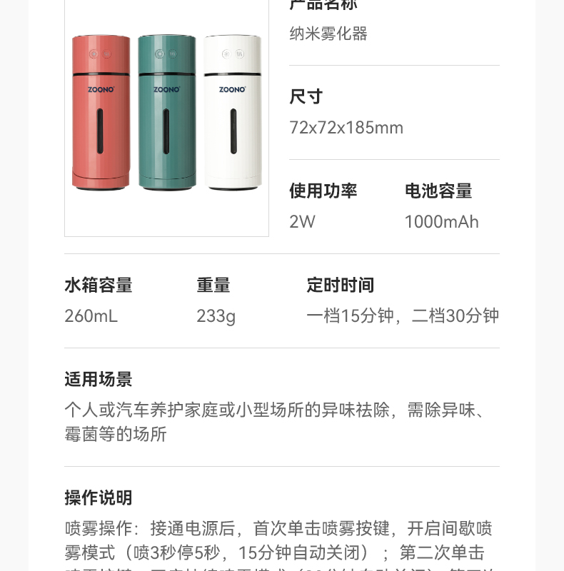 车用抗菌除臭补充液250mL+珊瑚红纳米雾化器